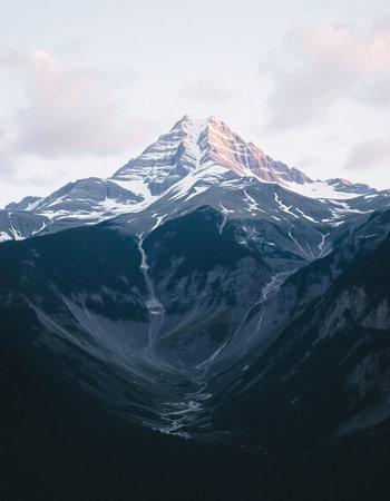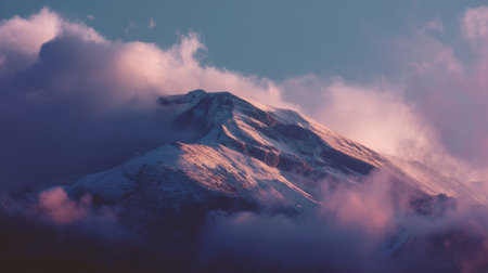 Experience the serene beauty of a majestic mountain peak draped in soft clouds at dusk. The light casts enchanting shadows on the snow-covered summit, inviting adventure.