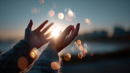 Artistic female hands in front of the sun, layered with bokeh light or lens flare for a dreamy atmosphere