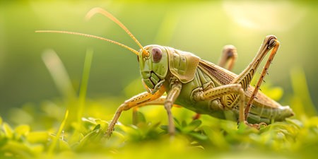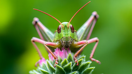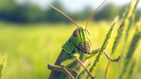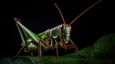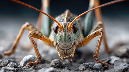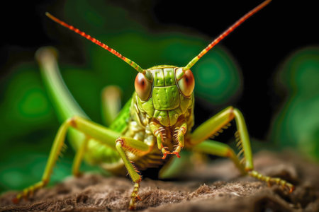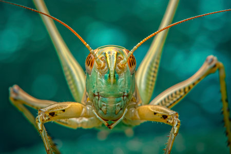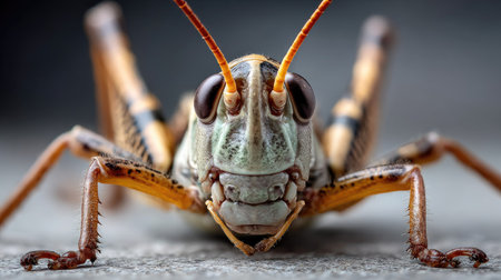 Grasshopper facing forward in extreme close-up. An agile insect with fascinating features, including unique antennae, powerful hind legs, and vibrant coloration. Generative AI