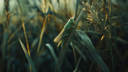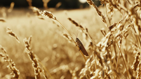 A stunning close-up captures a grasshopper resting on a wheat stalk in a golden field, illuminated by the soft evening light, showcasing nature's beauty.