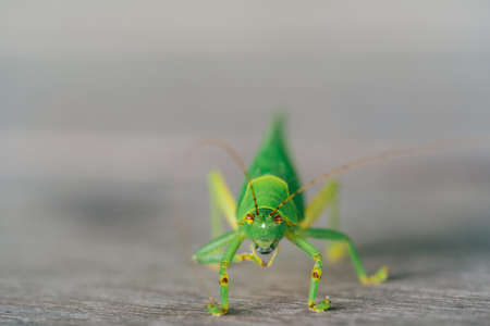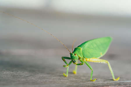 Green bush cricket or long-horned grasshopper licking legs on wooden floor, blur bokeh background with copy space
