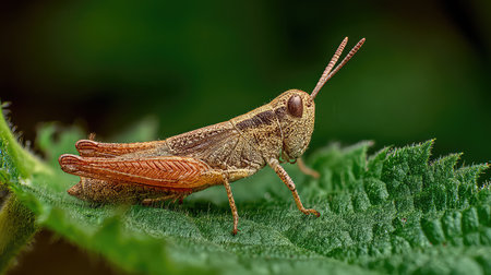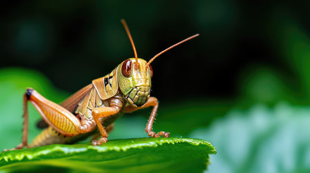 A detailed close-up photograph of a grasshopper perched on a green leaf, showcasing its intricate features and natural environment, creating a serene atmosphere.