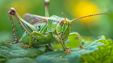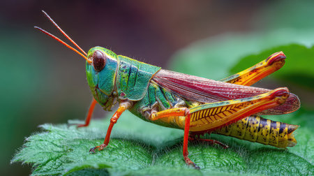 A vibrant grasshopper perched on lush green leaves, showcasing vivid colors and fine detail. This captivating image captures the beauty of nature.