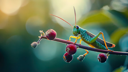 A vibrant grasshopper perches on a delicate branch laden with fresh berries, captured in soft natural light. The intricate details highlight the beauty of wildlife.