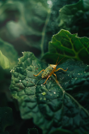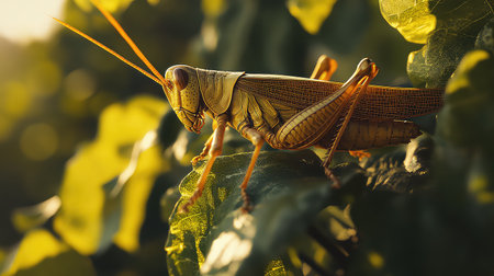 A stunning close-up of a grasshopper perched on a vibrant green leaf, showcasing intricate textures and warm morning light that highlights this insect's natural beauty.