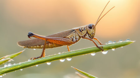 A stunning close-up image captures a grasshopper resting on a green blade of grass adorned with dew drops in the gentle light of sunrise, celebrating nature's beauty.