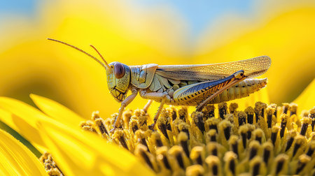 A stunning close-up capture of a grasshopper perched on a sunflower, showcasing intricate details and vibrant colors against a clear blue sky.
