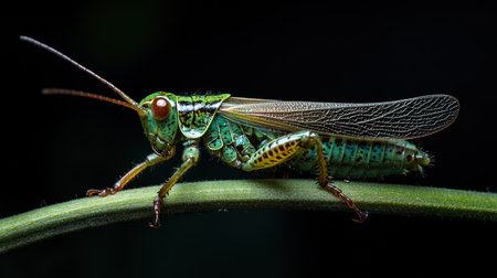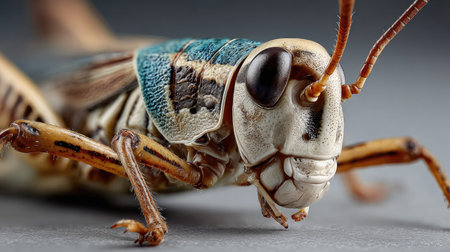 This stunning close-up showcases a grasshopper's intricate features and vibrant colors, revealing nature's remarkable details in macro photography.
