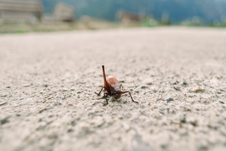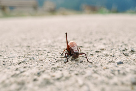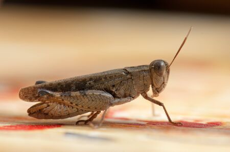 Grasshopper insect closeup antenna ground brown macro texture and detail of a small walking arthropod on concrete surface outdoors, natural portrait with shallow depth and blurred background