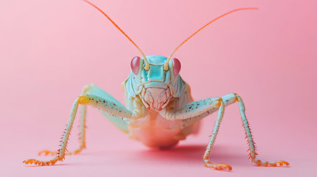 A striking blue insect stands out against a soft pink background, showcasing its unique features and vibrant colors in this detailed close-up view.