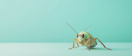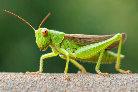 Close up of a vibrant green grasshopper resting on a surface, showcasing its intricate details, natural habitat, and vivid colors