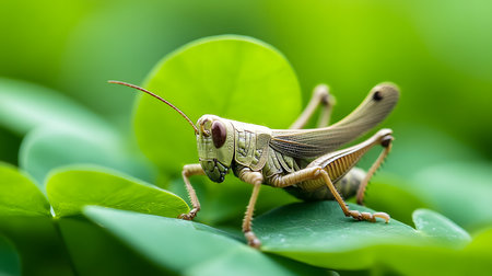 Vivid portrait of a grasshopper among vibrant green foliage, showcasing the insect's intricate detail. A.I.