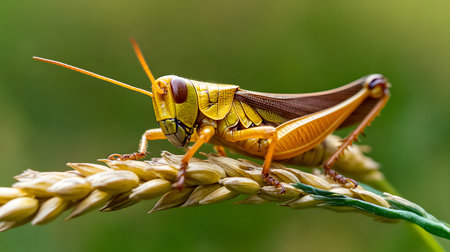 A striking yellow grasshopper rests on a ripe ear of wheat, showcasing intricate details of its body. The soft green bokeh background emphasizes the subject.