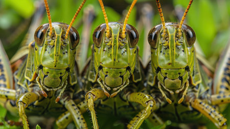 Three Green Grasshoppers: Macro Wildlife Close-up