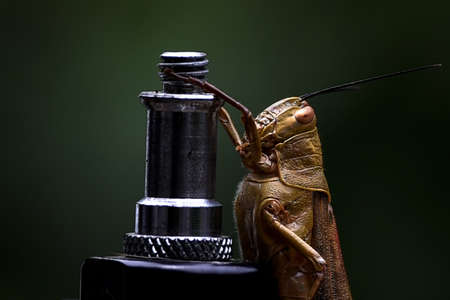 Extreme close up of huge brown, yellow and red grasshopper with two antennas. Insect is at the backyard, resting on metal fence and drinking clear water from the plastic bottle cap. Selective focus.