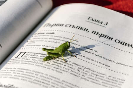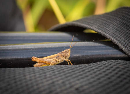 Closeup of brown and yellow locust (grasshopper) sitting on the black backpack in the green meadow