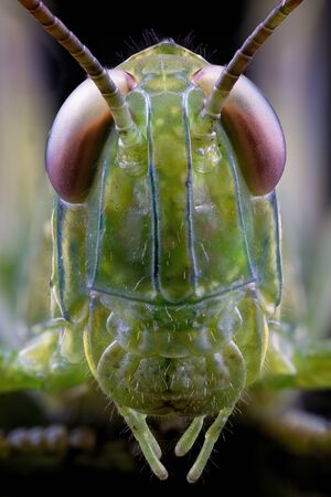 An extreme macro close up of the face of a green grasshopper, macro photography