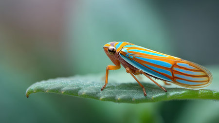 Close-up macro of a leafhopper with glistening wings and fine leg textures, set against a blurred green backdrop