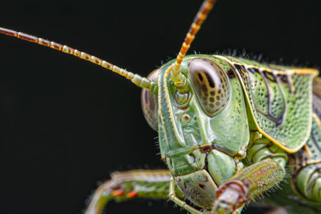 A green grasshopper is depicted in extreme close-up, highlighting its detailed eyes and long antennae against a contrasting dark background, showcasing its natural features.