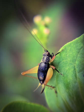 Close up of the Grasshoppers standing on green leaves with black background. Selective focus on green leaf.
