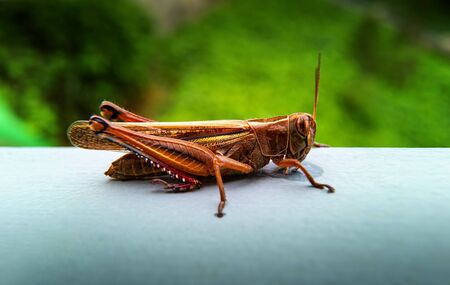 Extreme close up of huge colorful bright bronze, yellow and red grasshopper at the backyard. Insect is resting alone on metal fence. Selective focus. Unfocused green garden at background. Copy space.