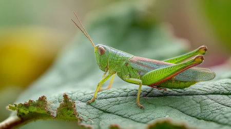 A vibrant green grasshopper perched on a leaf showcases detailed body features in its natural habitat. The soft-focus background enhances its vivid colors and serenity.