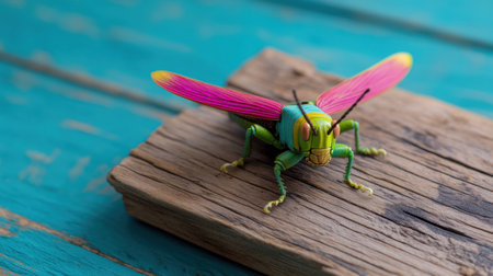 Vivid grasshopper resting on rustic wood, wings spread to show vibrant colors