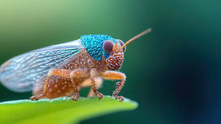 A stunning close-up view of a colorful cicada perched on a green leaf, showcasing intricate patterns and vibrant colors in a macro photo that highlights nature's beauty.