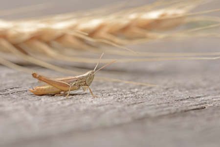 Locust on Wheat grain. Crop damage to whole grain harvest.