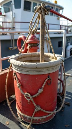 Vintage red sea anchor and pulley system on a boat deck.