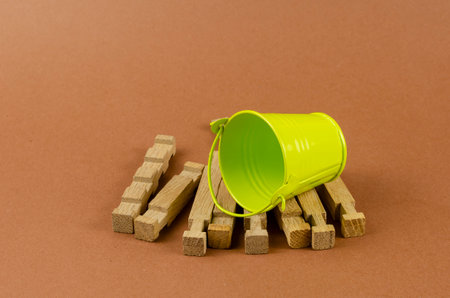 Children's wooden constructor in a green bucket on a brown background. Puzzle pieces in a empty metal bucket.