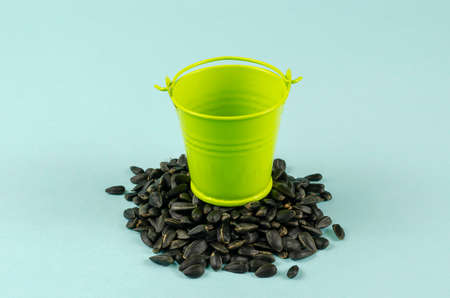 Roasted sunflower seeds and a bucket on a blue background. Empty Small green bucket and scattered seeds. Ready-to-eat snacks. Close-up. Selective focus.