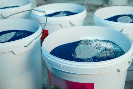 Production of decorative plaster at the factory. Materials for repair and decoration. Closeup of blue decorative plaster mixture in a bowl showcasing texture and contrast.