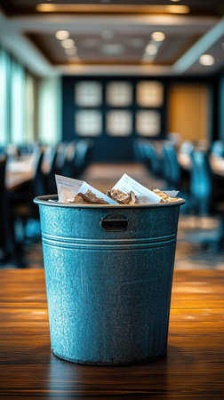 Blue trash can overflow with discarded paper sitting in the hallway of an office building