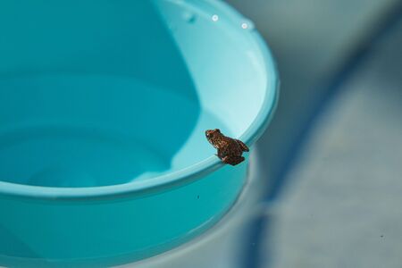 Small toad frog on edge of large turquoise plastic bowl swims by a pool