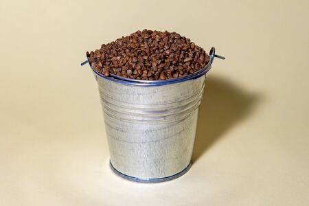Buckwheat groats in a bucket stand on a yellow background