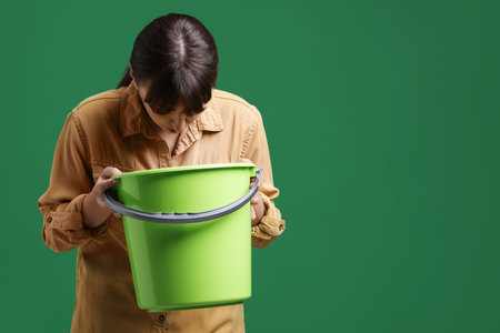 Young woman with bucket suffering from nausea on green background, space for text