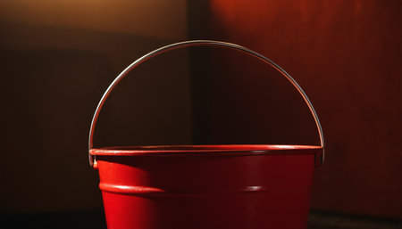 Red bucket in dark room, close-up. Gardening concept