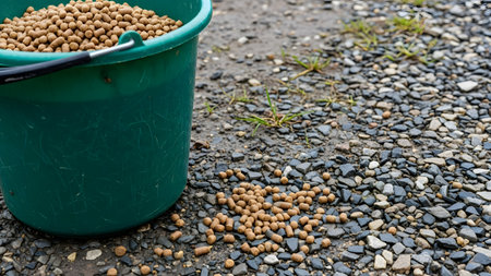 A green plastic bucket filled with brown animal feed pellets, with some feed spilled onto the gravel ground. The image represents livestock nutrition and daily farm chores.