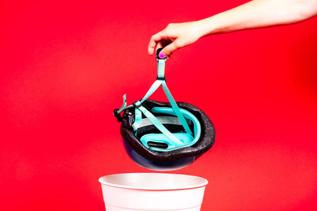 Photo of bike and engineer helmet in plastic trash bin, studio shot
