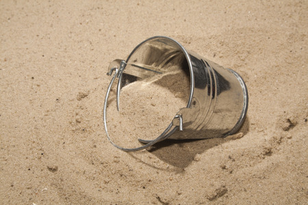 Bright bucket with sand lying by the beach.