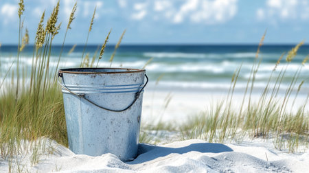 A sea bucket half-buried in the sand with a backdrop of beach grasses swaying in the breeze.