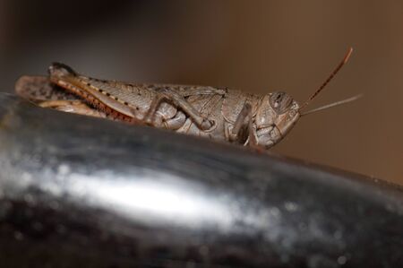 Canarian grasshopper Calliptamus plebeius on a water faucet. Cruz de Pajonales. Tejeda. Gran Canaria. Canary Islands. Spain.
