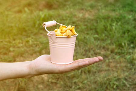 Metal pink bucket of fresh chanterelle mushrooms in hand, green grass bokeh on background
