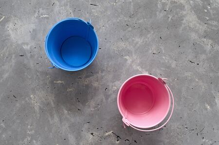 multi-colored empty mini buckets on gray background. Aluminum bucket for a flower garden for the manufacture of accessories for the home and garden floriculture planting plants summer season seedlings