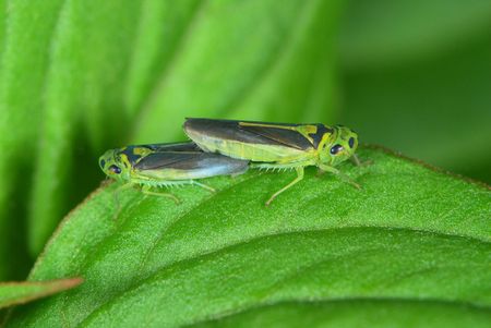 Green leafhopper insect on a tree leaf