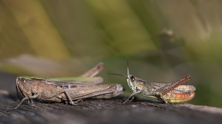 Grasshoppers fly on green blurred background - macro photography