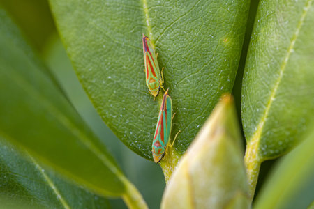 two green red rhododendron leafhoppers in a row on a green leaf seen from top with a rhododendron bud