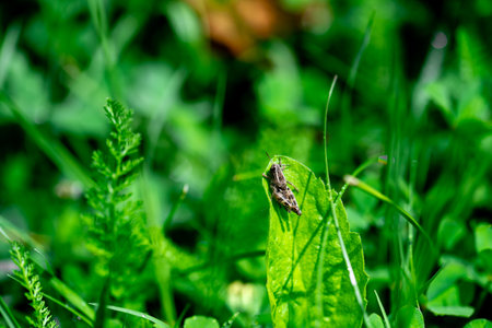 Brown grasshopper on green leaf nature background, insect macro grasshopper leaves