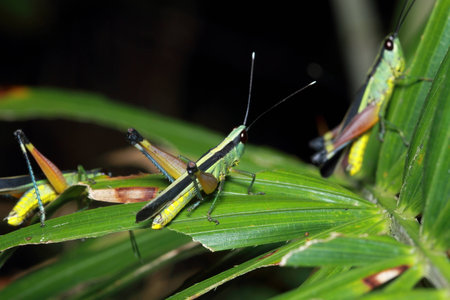 Close up of the Grasshoppers standing on green leaves at the background. Selective focus of the Caelifera on green leaf.